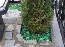 Покрасить ограду, так как чаще всего при установке ограды красят транспортировочной краской, которая приходит в негодность через год. Облицевать бетонный цоколь и бетон обрамляющий цветник. В данном случае для этого мы использовали керамогранит. Установили гранитные лавочку и столик. Посадили две туи и кустовые хризантемы в цветник. Заменили пластиковую вазу на гранитную. Уложили гранитную брусчатку на пол.