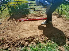 На каждом из четырёх углов вкручиваем сваи. Грунт на данной могиле попался твёрдый, после того, как сваи уже не вкручиваются, начинаем их забивать. Окончательно загнать сваи в землю так и не удалось, поэтому срезаем выступающие части. На качестве каркаса данное решение никак не отобразилось, так как длинна наших свай всегда несколько больше, чем требуется.